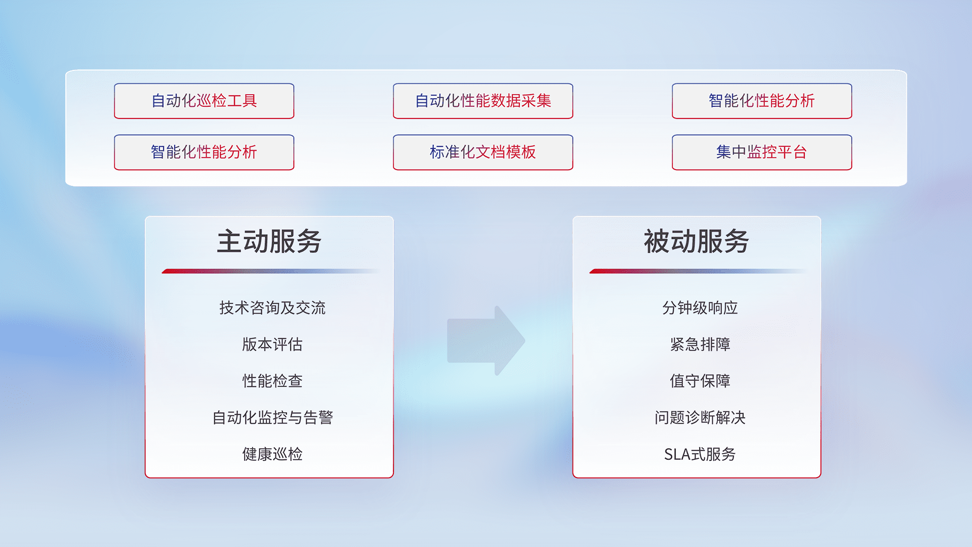 智能化工具和标准化文档,,保障服务质量,,提供主动服务(包含技术咨询、、、、版本评估、、性能检查、、、、自动化监控与告警、、、、健康巡检)和被动服务包含(分钟级响应、、、紧急排障、、值守保障、、问题诊断解决、、、SLA服务)。。